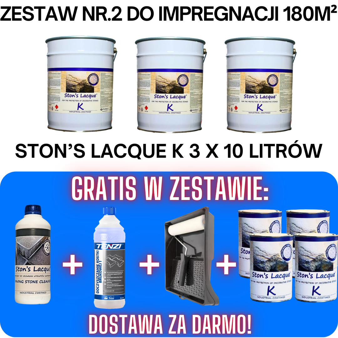 ✔ Impregnat Ston's Lacque K 30L (3x10L) – głęboka ochrona powierzchni i efekt mokrej kostki brukowej, który utrzyma estetykę na lata.
