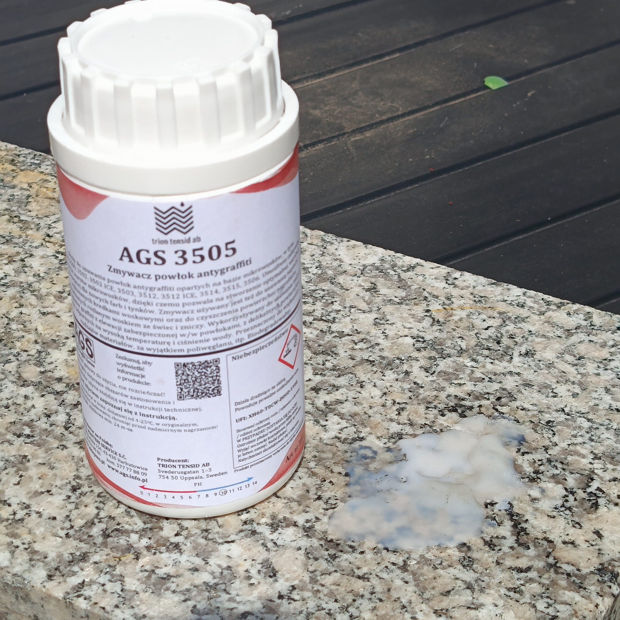 O: Preparat jest przeznaczony do większości twardych materiałów, takich jak granit, lastryko, piaskowiec czy beton. Jest jednak bardzo silny, dlatego nie należy go stosować na delikatnych tworzywach sztucznych (np. poliwęglan). Zawsze, przed pełnym użyciem, wykonaj próbę w mało widocznym miejscu.